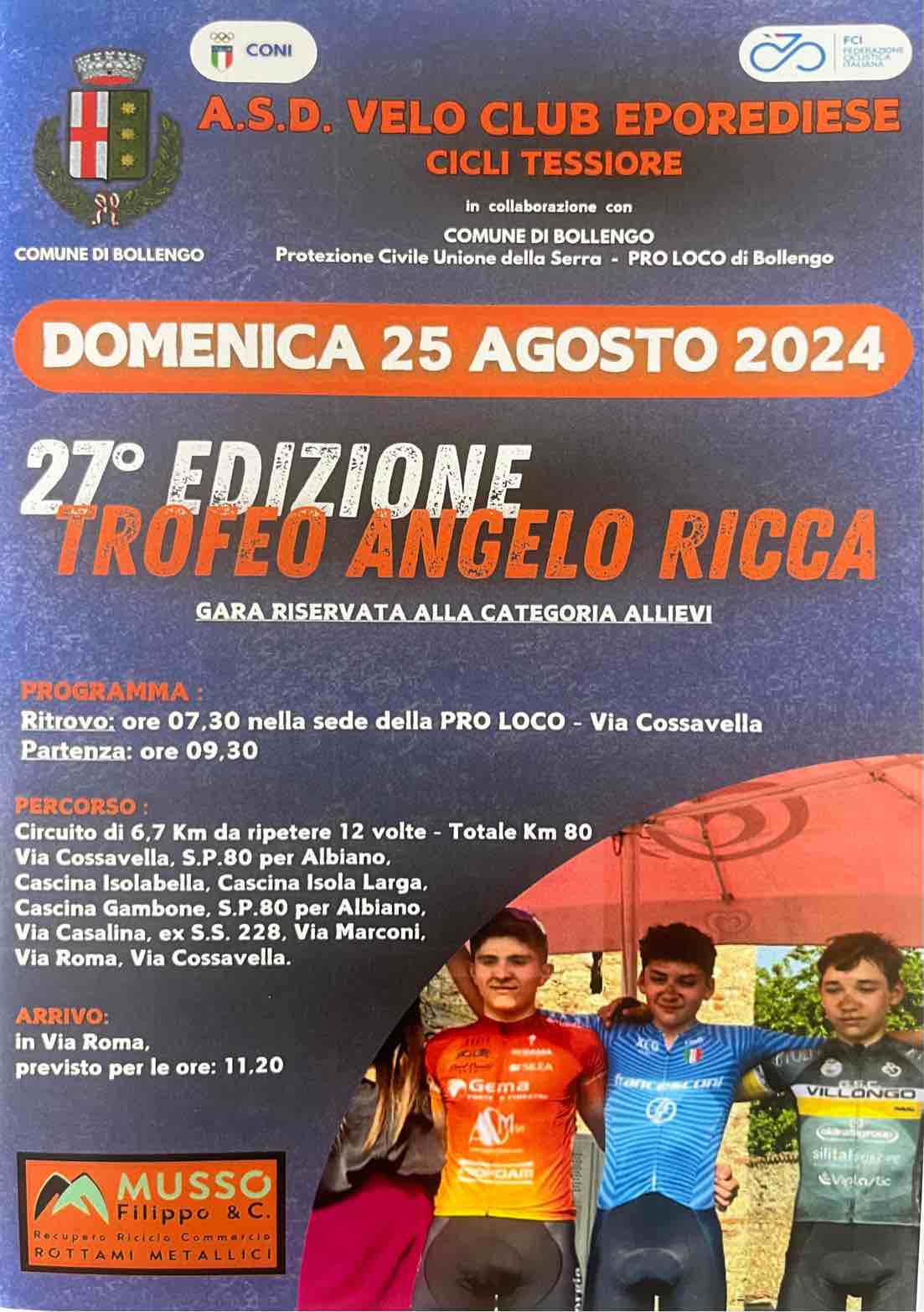 Domenica 25 agosto 2024 si svolgerà la 27° Edizione del Trofeo Angelo Ricca. In allegato il programma dettagliato della gara ciclistica.
