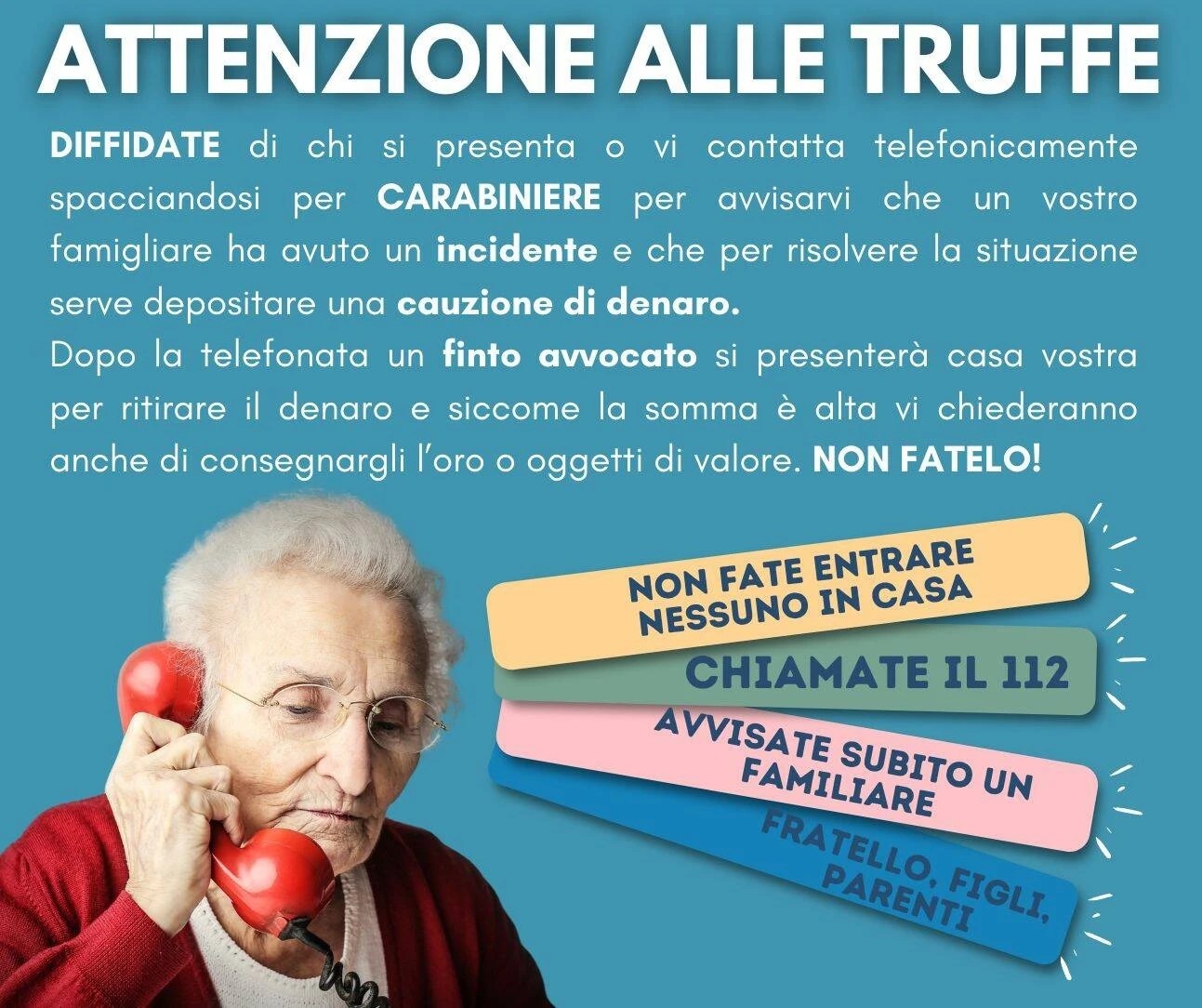 Le modalità di truffa sono molteplici; una delle più diffuse consiste in una chiamata al telefono in cui viene comunicato un incidente e/o ricovero e/o necessità di acquistare un farmaco molto costoso per qualcuno della famiglia (figli, nipoti), con conseguente richiesta di disponibilità di denaro contante i simili: DIFFIDATE DI TALI COMUNICAZIONI, verificate con i vostri famigliari l'accaduto e in ogni caso SEGNALATE ogni episodio sospetto alla Stazione Carabinieri di Azeglio (tel 0125 72107) oppure al Numero Unico di Emergenza (112)